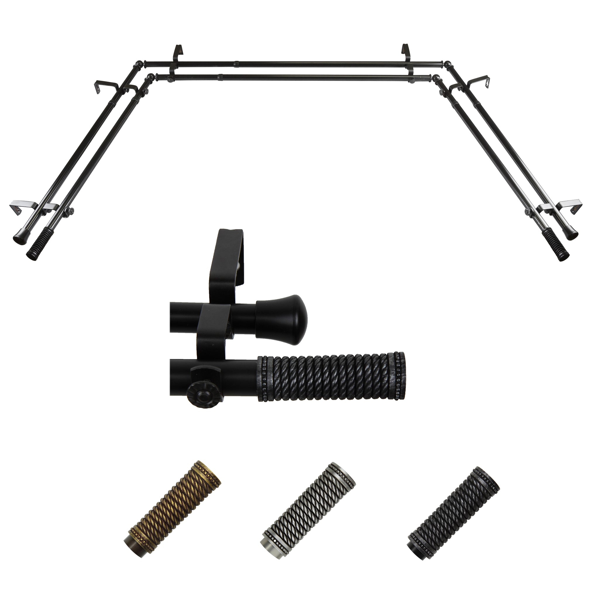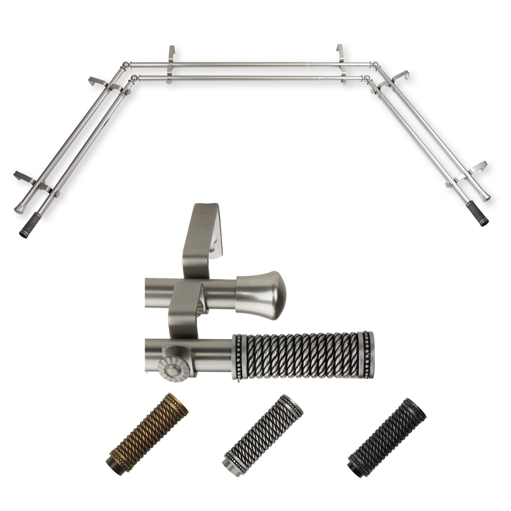 Includes four 13/16" diameter adjustable 20-36 inch poles, two adjustable 38-72 inch poles, one pair of finials, 6 brackets, 4 corner connectors, and mounting hardware