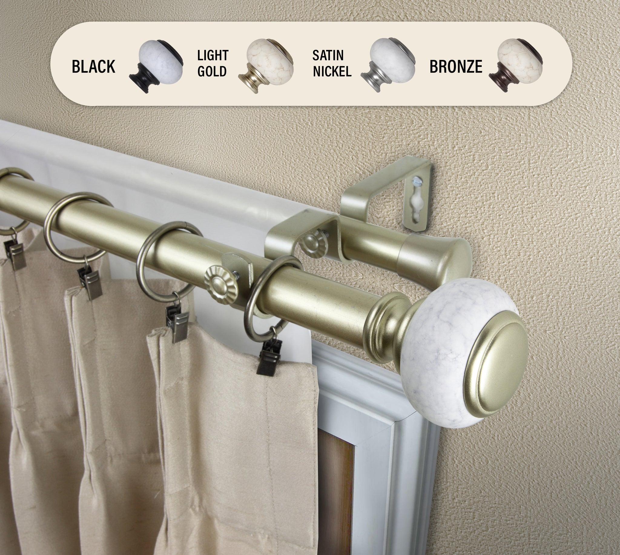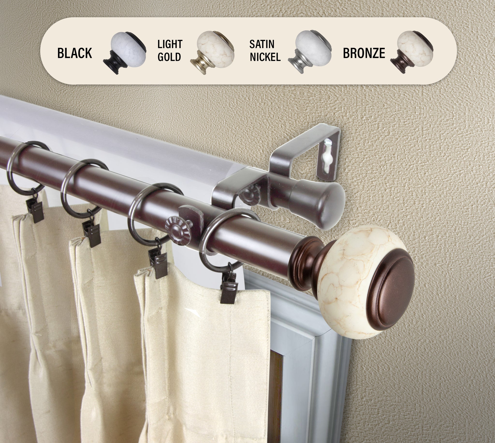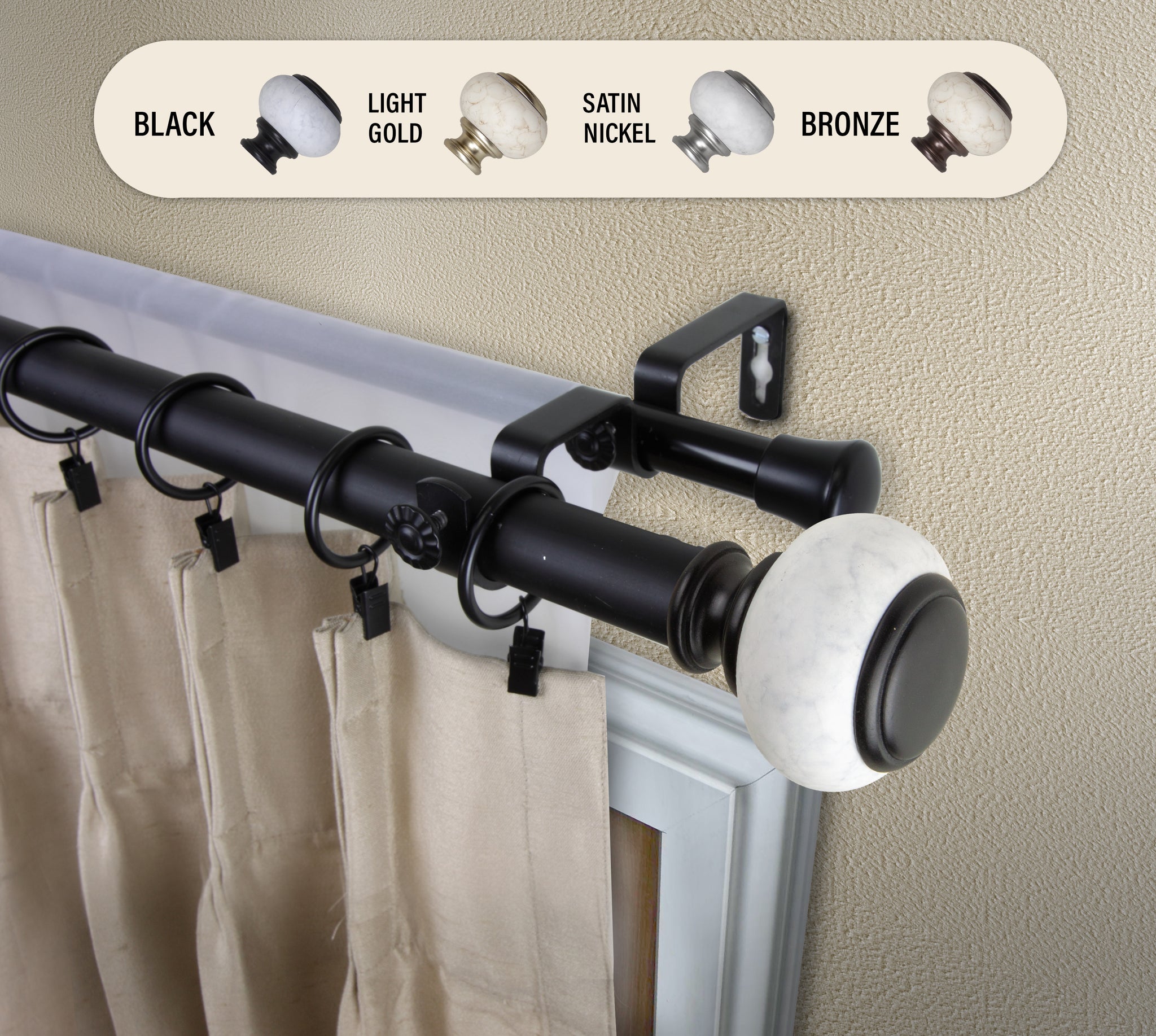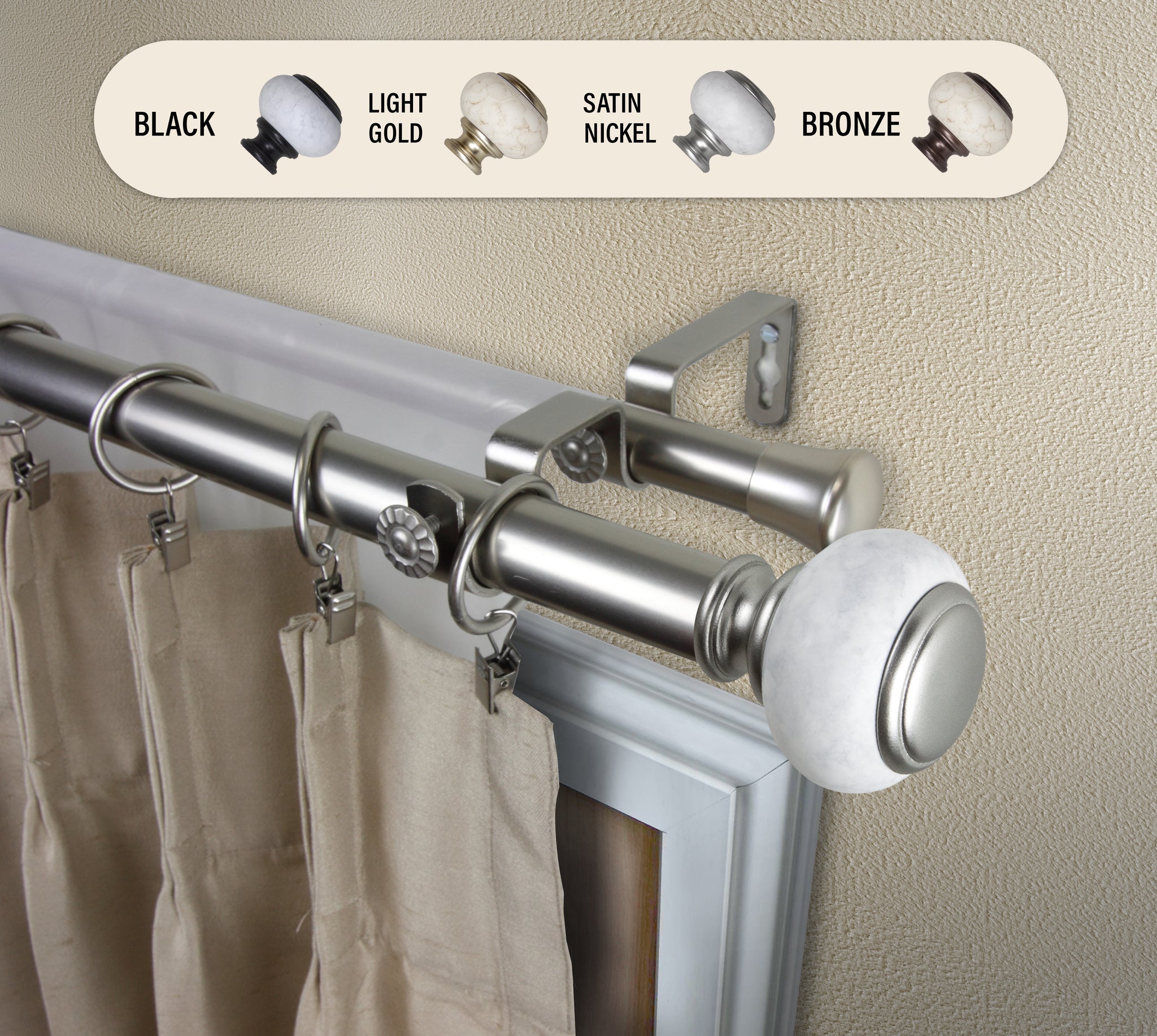 Includes one 1" high-quality steel telescoping pole and one 13/16" adjustable back rod, two finials, double brackets, and mounting hardware