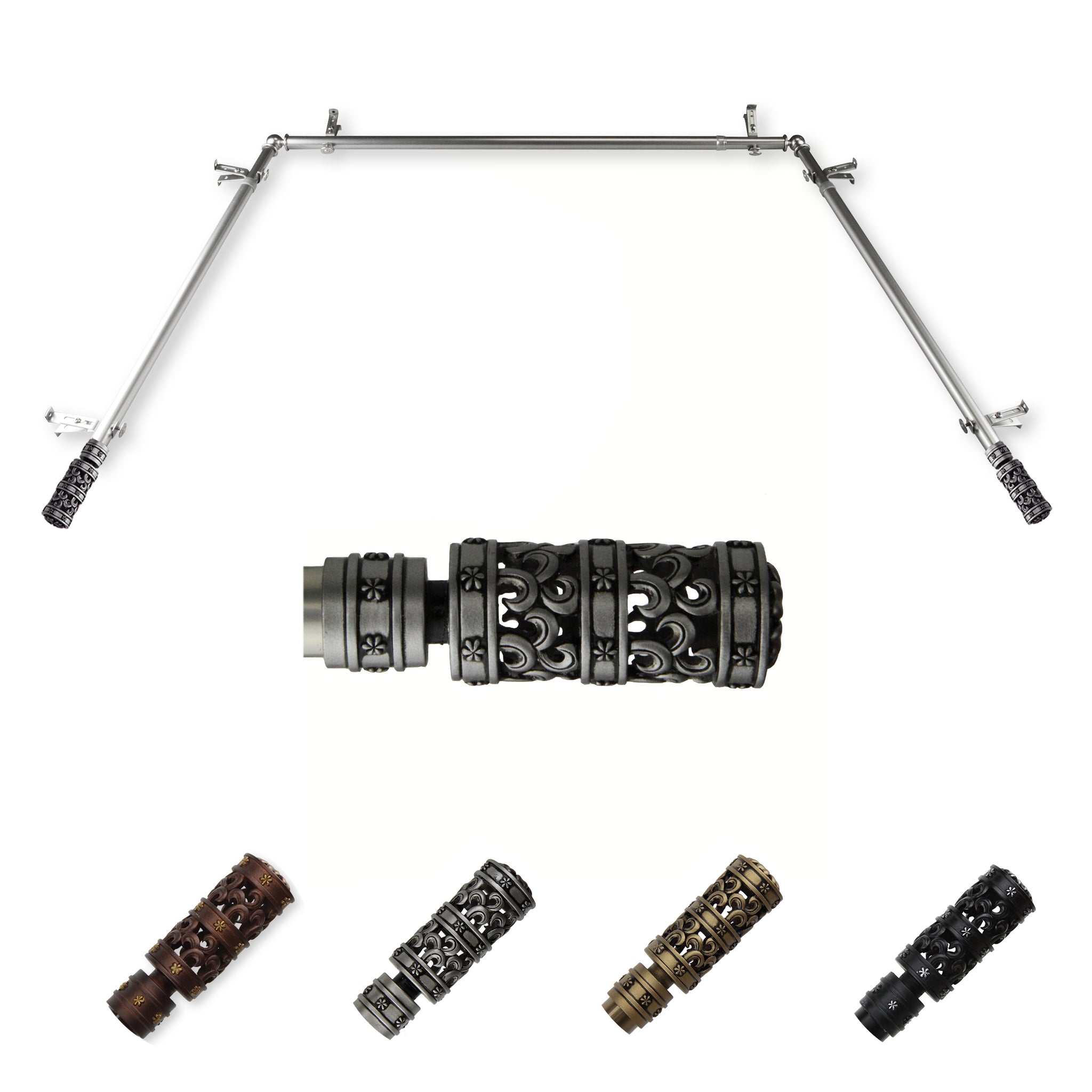Includes two 13/16" diameter adjustable 20-36 inch poles, one adjustable 38-72 inch pole, one pair of finials, 6 brackets, 2 corner connectors, and mounting hardware